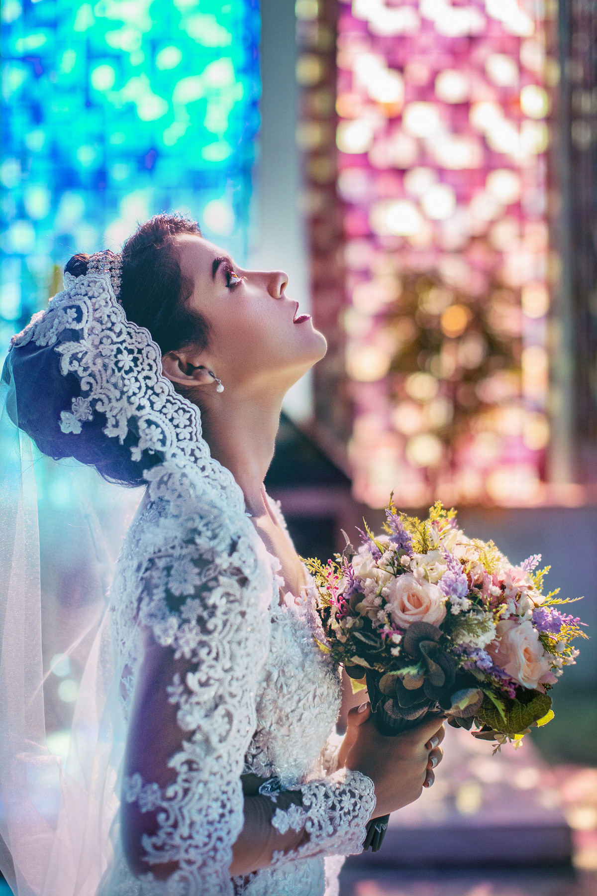 Noiva em frente a vitral no santuário dom bosco em brasília. Foto feita pelo fotógrafo de casamento Rafael Ohana em Brasília